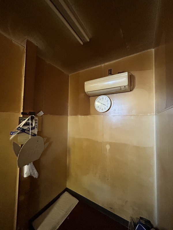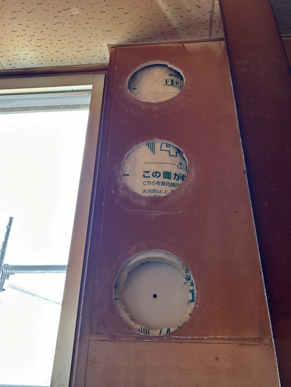 壁へダクト穴を開ける段階で以前の改装工事で二重壁と判明し