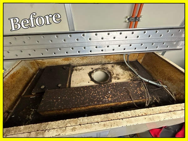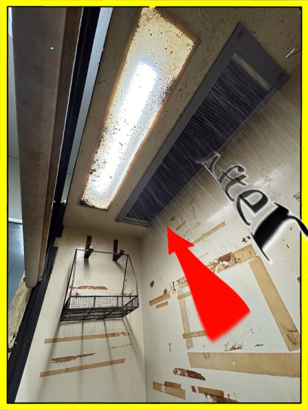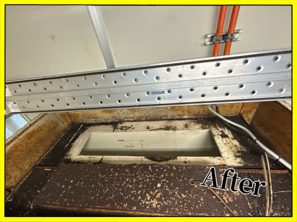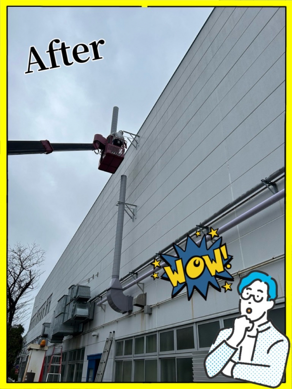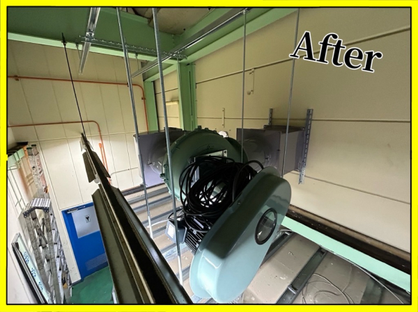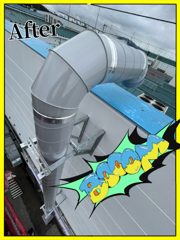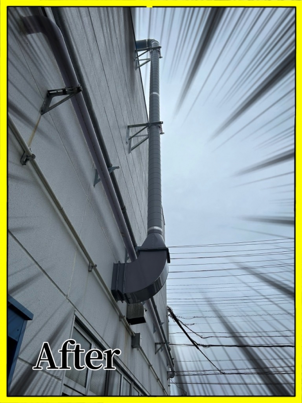 局所排気ダクトになります。今年初め頃、こちらの別工場でも施工致しました。今回は既存の局所排気ブースを基準に合う様に改造してほしいと元請より依頼を請けての工事になります。3年半程前にもまた別の工場ですが改造をしておりましてその時の経験からもう少し安全率を大きくとっています。(この辺りの加減が難しいです!)ブースより古い機器の取外しから取り掛かり、固定方法とか不明なので手探りな感じで撤去して行きます。思ったより順調に解体は進みまして、但し溶剤の為でしょうか手についたりすると皮膚がカサカサになります。ヘルメットのバイザーを下げて目の保護をしながらの作業でした。この日は雨でしたので外部作業は大変でしたがそれでも順調に進み試運転でも余裕をもってクリアできたので良かったです。
