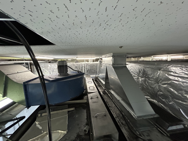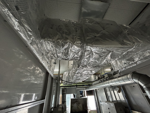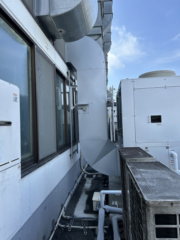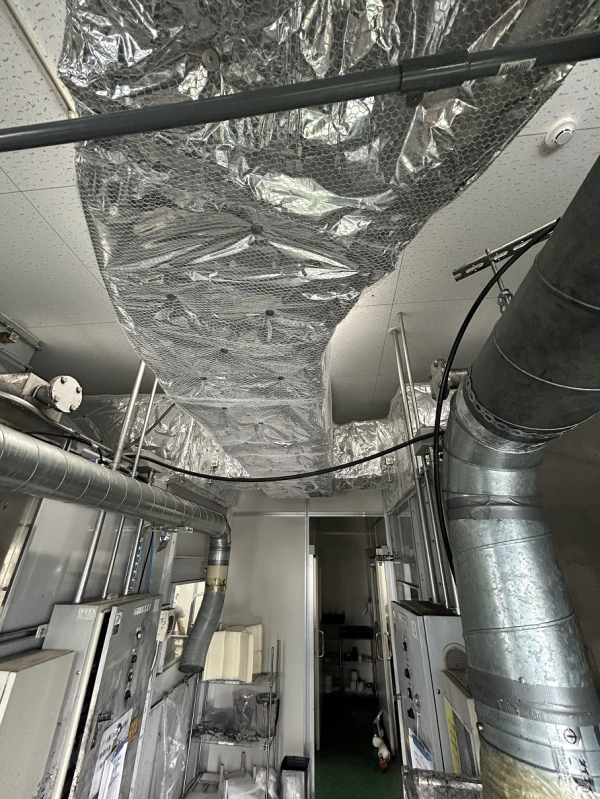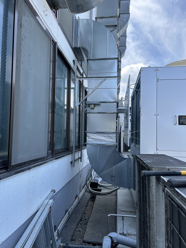 塗装ブース内作業環境改善から従来の全外気による給気から客先手配による外調機を用いてクリーンで空調の効いた給気に改造する工事を行いました。外調機を通した風は前室と呼ばれる作業員が居るエリアに導入します。全外気による給気ダクトはルートを変更して塗装ブース内の人の居ないエリアに導入して給排バランスをとるようにしています。外調機から建屋内までの外部ダクトは断熱工事他、そのままですと断熱材が雨等で傷んでしまうのでラッキング工事を施します。平日は工場が稼働する為、切替工事含め2週土日工事となりました。その後暫くは塗装品質からデータを取りながらお客様により調整頂く様な感じになっています。