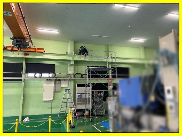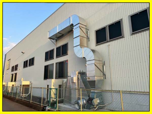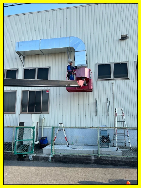 いつもお世話になっておりますこちらのお客様ですが塗装ブースや大型成型機の入替に伴う給排気のバランスから給気の増強工事行う事となりました。6年前に同じ能力で中性能フィルターを使った給気工事をしており今回1系統増やす工事です。高所になる為、建屋内は移動式足場を設置し外部は高所作業車を使っています。下調べと今迄の工事データが有るので問題となる事も無く進めていきます。フィルターケースは屋外仕様ですが吸込口からの雨侵入でフィルターが濡れてしまわない様、後日建築工事にて囲い建てる事になっています。試運転結果も問題なく完了です。