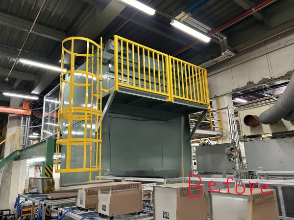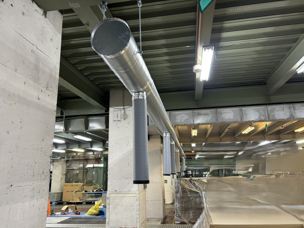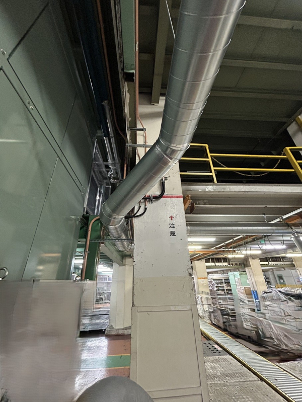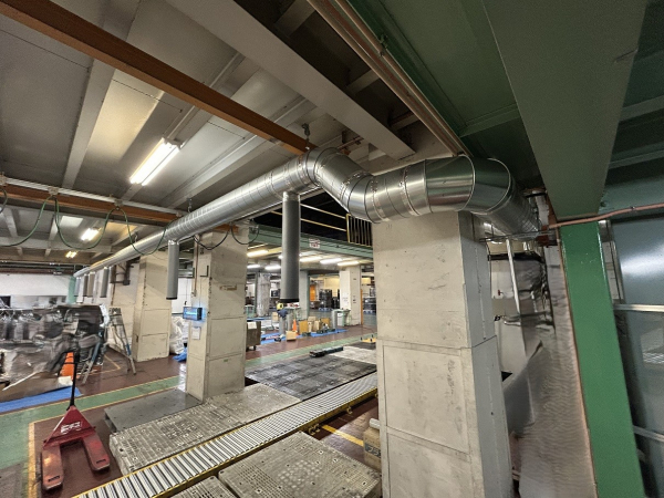 既設の送風装置から新たにダクト配管でスポット送風したいとのご依頼です。数年前から計画され、その間にルートが変わったり昨今の物価高から再見積もりの繰り返しでこの度ようやく施工の運びとなりました。あくまでも空調ではない送風装置との事から断熱はありません。途中配電盤の開き蓋を交わさないといけない変更はありましたがおおむね順調に納まりました。