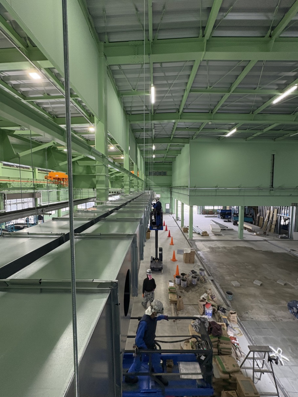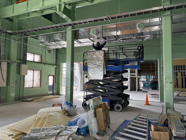 現在、工場新築工事に携わっています。いつもお世話になっているお客様が工場新築される事に伴って空調と塗装ブースその他のダクトを手掛けております。空調ダクトにおいては古くからこちらに入っておられる空調業者様からの依頼になります。別の工事でも弊社とお取引しておりまして今回ご縁からご依頼頂いております。設置場所は吹き抜け状になっており非常に高い場所へ吊金物をセットしなければならず作業床8m位になる高所作業車を使用しています。梁へ吊金物をセットし柱から振れ止めを取っていきます。事情から約30mを2系統、2日で吊り込み3日目に断熱工事をして一旦完成です。この後3月末から空調機と接続する工事が始まります。建屋外部まで伸びる為、外は断熱+ラッキングによる鈑金工事もあります。