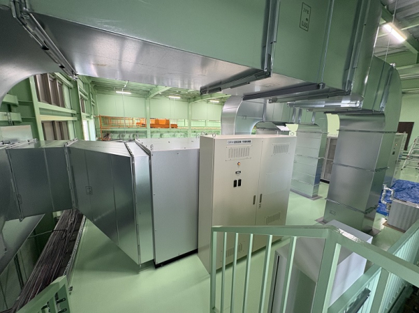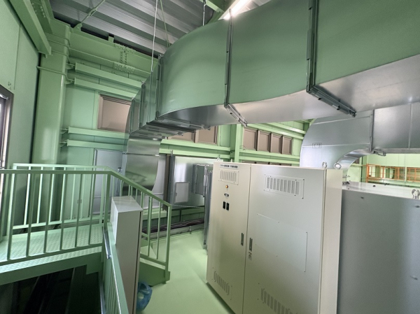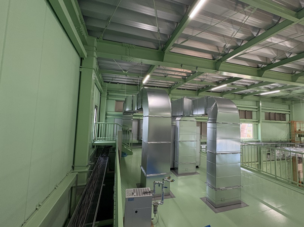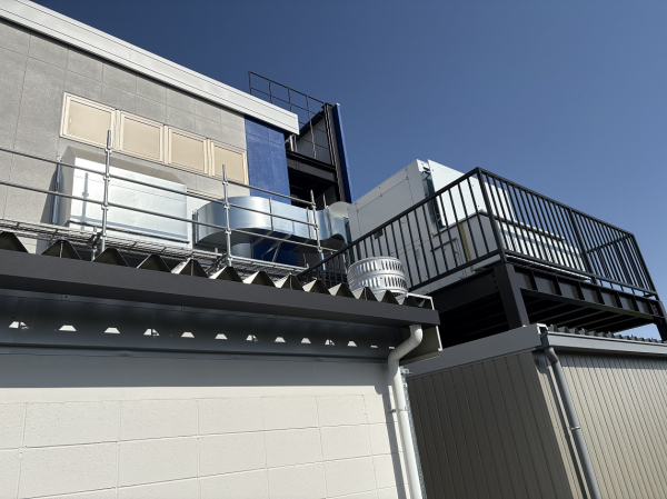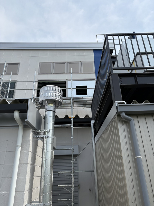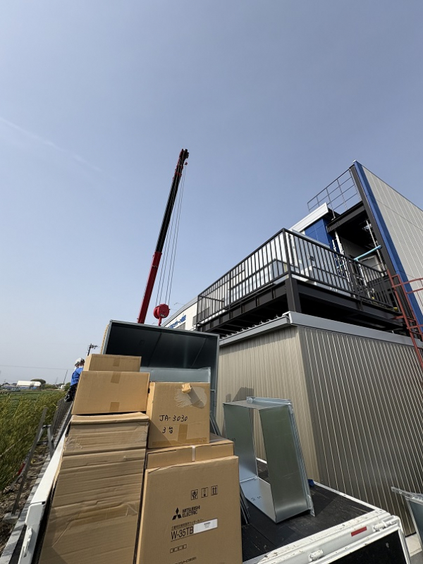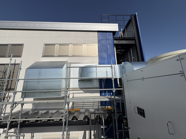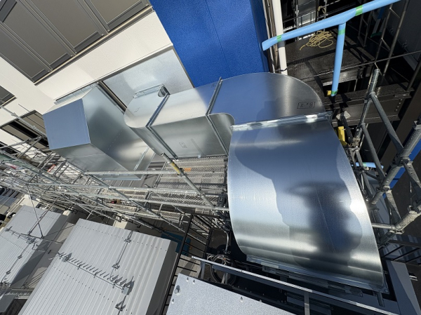 塗装ブースの続きとなります。ブース内に取り入れる空調と給気ダクトの工事になります。事前に足場を設置してカーゴクレーンによる作業で搬入設置をしていきます。将来サッシを外してダクトを引入れる事が出来る様に建築設計先生と設計段階から打合せ致しておりますので取付はスムーズに進みます。最終的に塗装ブースと接続するのですがこの段階ではまだ出来上がっていない為、中二階床貫通までで後日接続工事となります。空調ダクトは断熱と外部に至ってはその断熱を覆うラッキングカバー工事があります。その工事についてはダクトがブースと全てつながってからとなります。