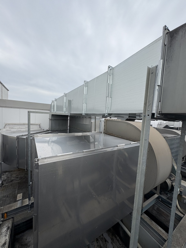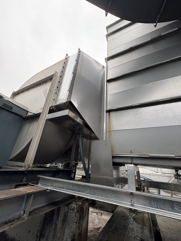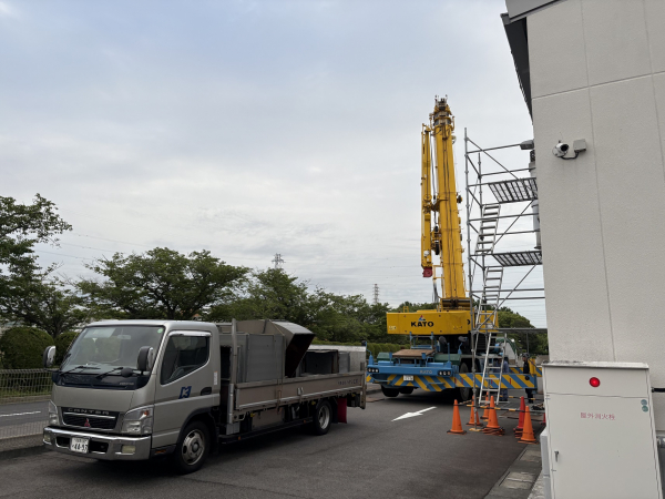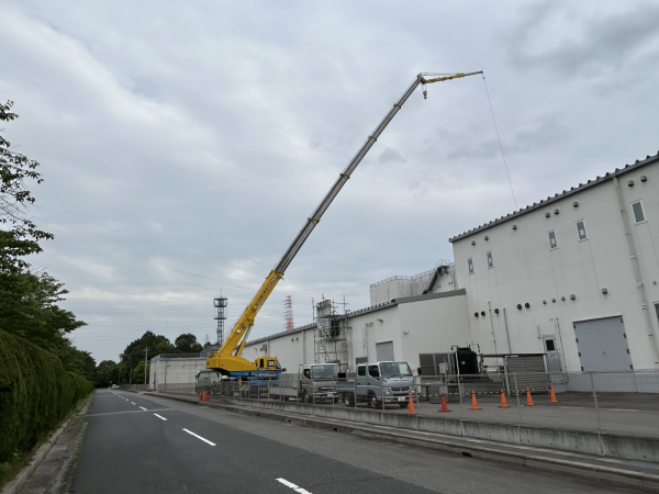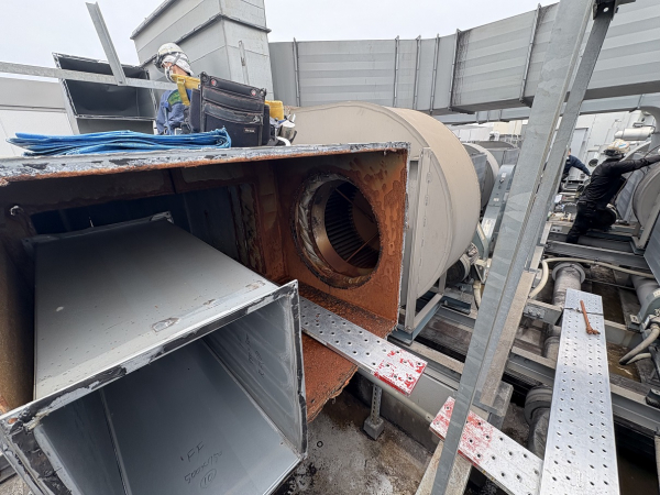 こちらのお客様とのお取引はまだ2年弱になのですが当時から既に今回交換に至ったダクトの錆腐食が目立っておりました。24時間操業ですので簡単に排気ファンを止める事も出来ず様子見となっていましたが、ついにフランジを残して鉄板に亀裂が入ってしまいもはやダクトの機能を果たさなくなってしまいました。排気ファンの振動もひどくメンテも同時に行う理由からこの度改修工事となりました。屋上各設備機器等全て建物中央部に設置されており水平距離で35mから40mも離れています。当然25トンレッカーでは届かないので業者に下見してもらい75トンレッカーを手配する事になりました。しかーし3トンのウェイトも背負っているにも拘らずビミョーに届かなく大変苦労しました(泣)レッカー業者さんに見てもらったのにこれには参りました。排気ファンもシロッコファンドラムの補強が溶接部から外れてダクト内に転がっておりこれによってバランスが崩れ酷い振動が発生していた様です。客先手配によりすぐに業者さんが駆けつけてくれその場で直してくれました。ダクトに関しては水蒸気が非常に多く発生する系統でしたので既設は高耐食鋼板を使用していた所を今回はステンレスで提案し更に既設は板が薄く人が乗ると凹んでしまう事から板厚を上げています。その後は順調?に入れ替えて最終的には製造部署よりかなりせかされる様にして完成となりました。