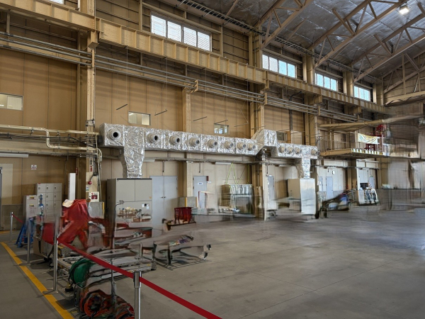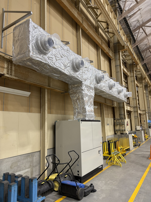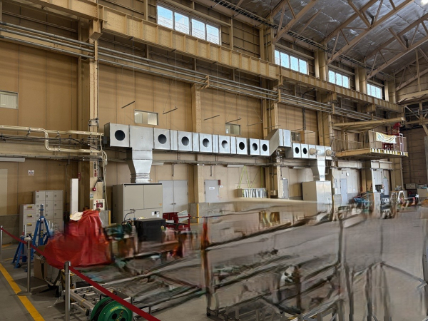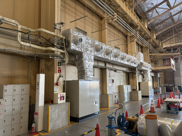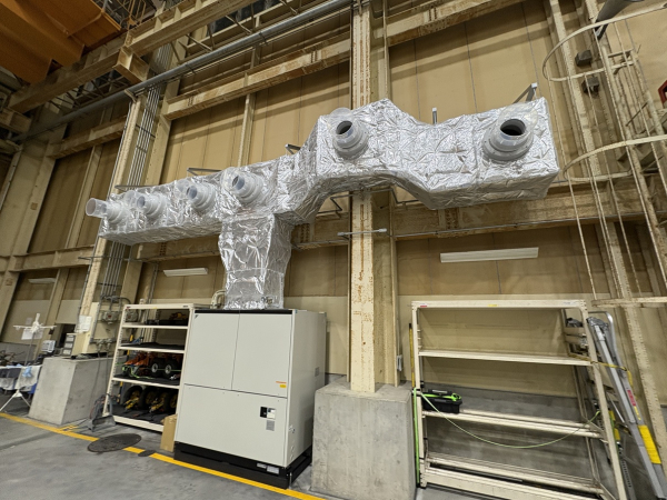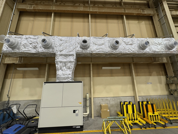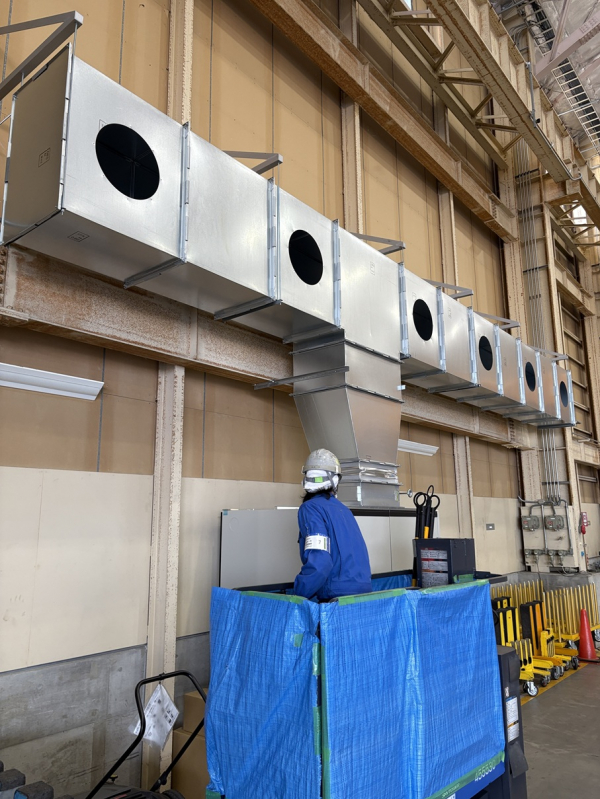 こちらは空港内施設の空調ダクト工事となります。天井も高く扉も開放されている事が多い為、作業者までノズルを使って風を送るスポット空調となります。なるべく張出を抑えて配管をしなければならず一部は柱を巻く様な形となります。空港施設という事もあり工具やボルト類等の落下紛失はあってはならない為、高所作業車の籠は全てブルーシートで覆われております。作業時は下で監視員を配置して落下物や通行人に注意を払っての作業となりました。毎週土日での作業を3週に渡って行い無事に完了しました。